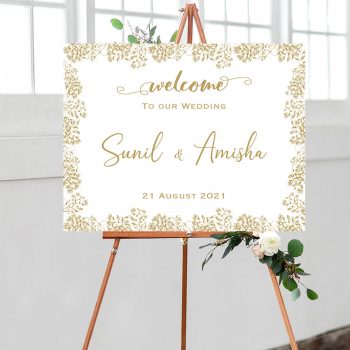 A minimalist floral themed wedding welcome sign that has a cute design on all four corners.  Contained within the design is a line that reads ‘welcome to our wedding’, followed by the names of the couple and the date of the function.