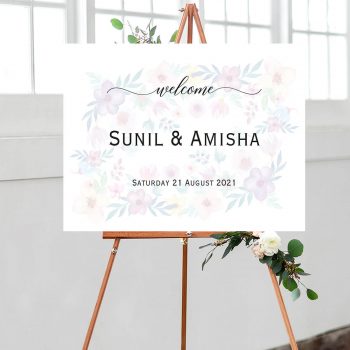 A very popular wedding welcome sign amongst those that have a floral theme. This welcome sign has a floral design at the top and one at the bottom. In between the two designs, you will see the line ‘welcome to the wedding of’, the couple who are getting married, along with the date of their event, which can be seen at the bottom. This design can be used for weddings, wedding receptions or any wedding related events.
