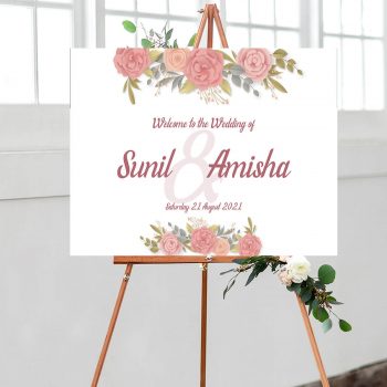 A sign for your wedding day, welcoming guests to the festivities with a floral design that’s both romantic and elegant. The dark red and pink colours are perfect for a vintage or country style event. Comes in three sizes: A2, A1 or A0.