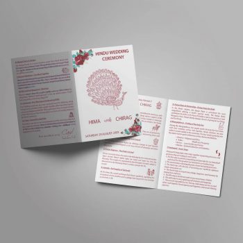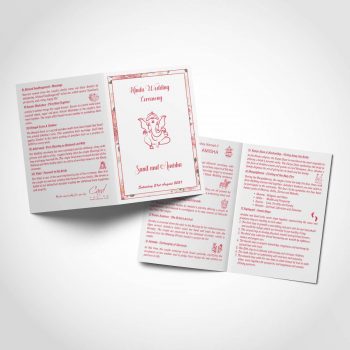 Each Hindu priest conducts the ceremony in their own unique way, hence why the contents of the booklet, even if it is for a Hindu wedding, can vary. Some of the steps that are included in the Hindu wedding ceremony are; Jaan Aagman (Arrival of the Groom), Vaar Puja (Welcoming of the Groom), Kanya Aagman (Arrival of the Bride), Kanyadan (literally means ‘gifting a girl’) and more. If you have a theme or colour scheme, let us know and we can look to match the wedding ceremony programme details to it (to ensure consistency).