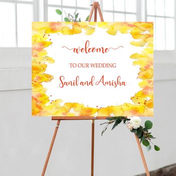 A minimalist floral themed wedding welcome sign that has a cute design on all four corners. Contained within the design is a line that reads ‘welcome to our wedding’, followed by the names of the couple and the date of the function.