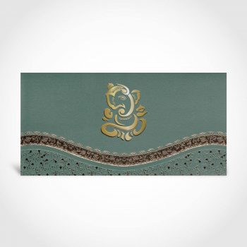 Celebrate the sacred union of two souls with our captivating Hindu wedding card, printed on premium white cardstock. A masterpiece that beautifully blends tradition and elegance, it features a gold foiled round floral pattern symbolizing the eternal journey of love. Within this resplendent design, the divine presence of Lord Ganesh shines in glorious gold foiling, bestowing blessings upon the couple’s sacred union. Elegantly personalized with the names of the loving couple foiled in gold at the bottom, this invitation becomes a cherished keepsake.