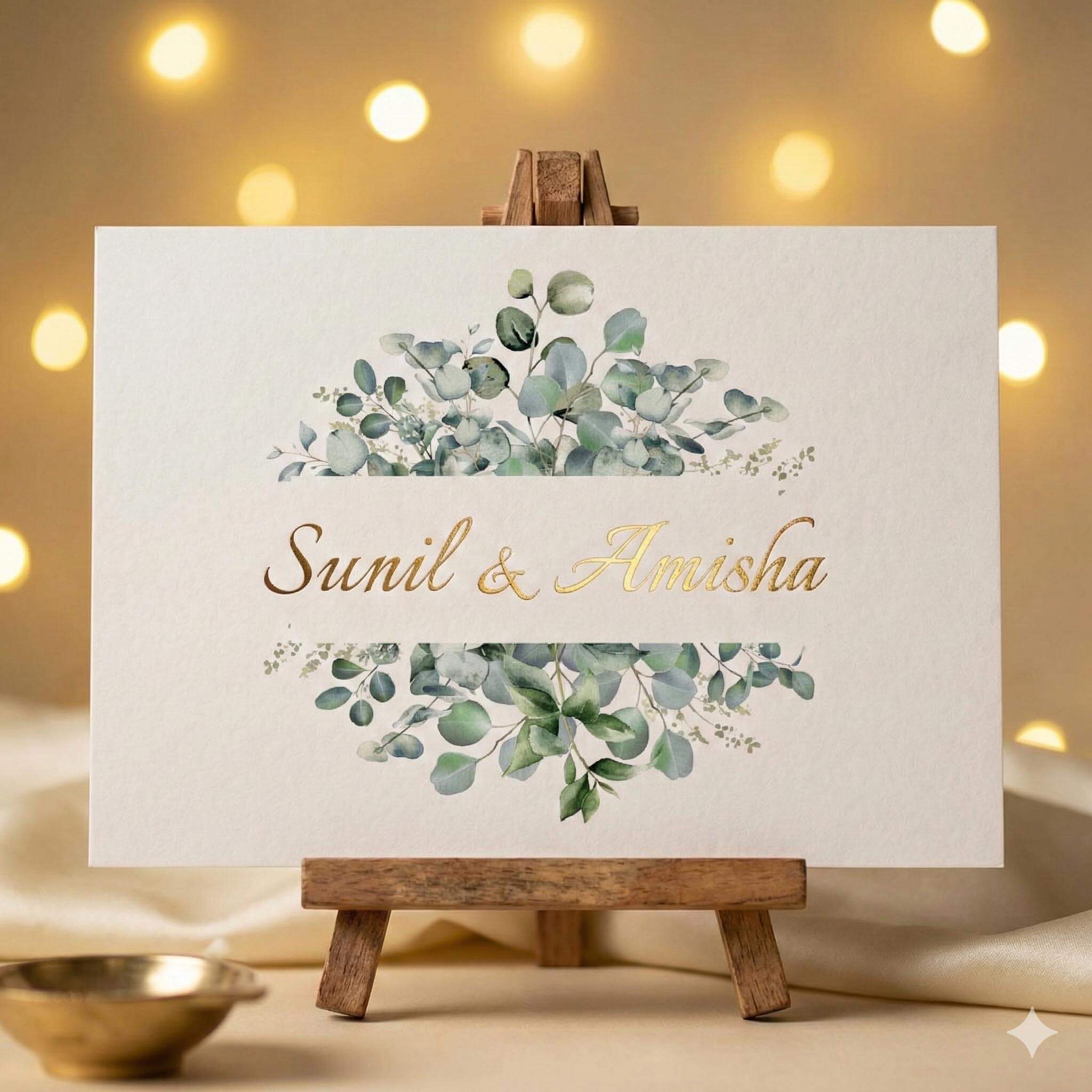 Your wedding invitation is the first glimpse your guests will get of your celebration. Make it unforgettable with our modern, elegant Eucalyptus Gold Foil Hindu Wedding Invitation. Perfectly balancing contemporary botanical design with the luxurious tradition of Indian weddings, this card is designed to leave a lasting impression.