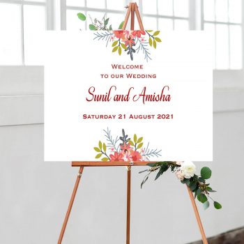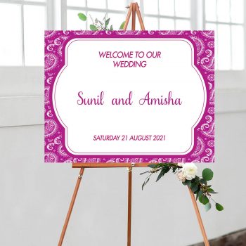 Welcome your guests with this blue ornament bordered wedding welcome sign. Each corner has the same pattern, almost offering a symmetrical design. Within the border, you will find a personalised welcome message, which can include a line such as ‘welcome to our wedding’ or ‘welcome to the wedding of”, which is then followed by the couples names, which are written in a fancy font and a focal point of this welcome sign. The bottom of this sign has the date of the function to add that extra level of personalisation.