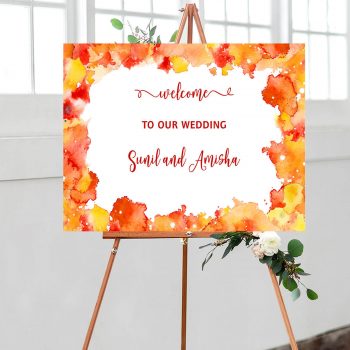Welcome your guests with this blue ornament bordered wedding welcome sign. Each corner has the same pattern, almost offering a symmetrical design. Within the border, you will find a personalised welcome message, which can include a line such as ‘welcome to our wedding’ or ‘welcome to the wedding of”, which is then followed by the couples names, which are written in a fancy font and a focal point of this welcome sign. The bottom of this sign has the date of the function to add that extra level of personalisation.