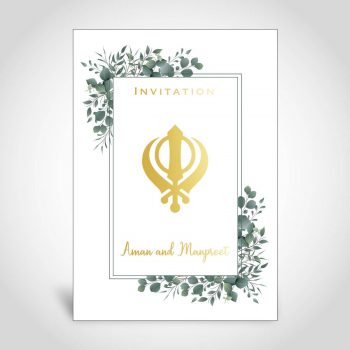 This Punjabi wedding card is perfect for a traditional Indian or Sikh wedding with gold foiled Khanda, a floral frame and printed on White card.