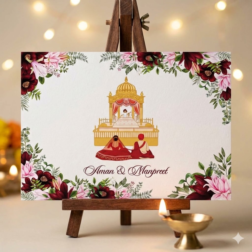 Design Details This invitation features a hand-illustrated centerpiece depicting the Anand Karaj ceremony. It showcases the bride and groom seated respectfully before the holy Palki Sahib, symbolizing the spiritual union of two souls. The central illustration is framed by a luxurious border of burgundy and soft pink floral motifs with lush green foliage, adding a touch of natural beauty and sophistication.
